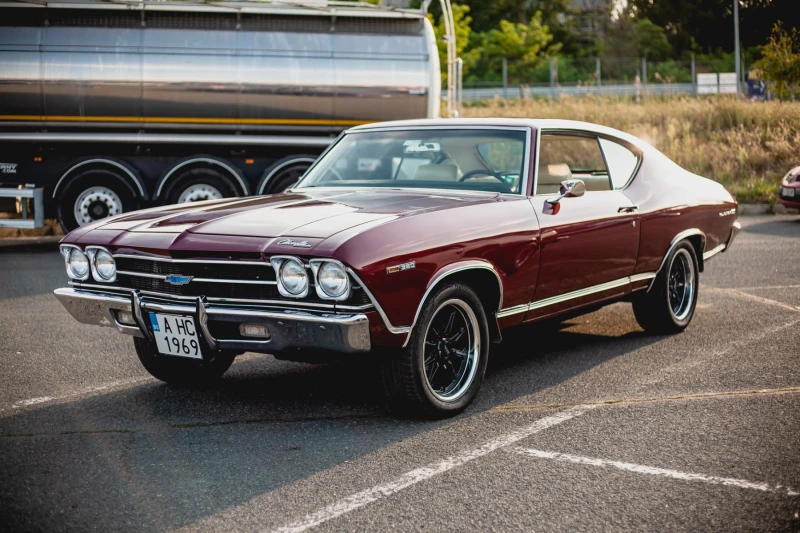 Chevrolet Chevelle 1969. Chevy SBC & Muncie 4 speed manual transmission. Пробег в Мили: 52397 на пристигaнe от щатите. Не мога да потвърдя действителни или не. В момента - 55К+-. Колата е в много добро общо техническо и визуално състояние. Заводска хидравлична кормилна уредба и серво спортни дискови спирачки. Работещ заводски климатик. Диференциал 10 болта. Ненатрапчива изпускателна система Flowmaster с безпогрешен V8 звук. Всички стъкла, включително и челното са тонирани със слънцезащитно фолио. Aлуминиеви джанти American Racing. Подробности: Шасито и долната част на купето - са антикорозионно обработени, след това е нанесен шагрен-раптор. Всички кухини в купето, шасито и подкалници са третирани/пръскани с технически парафин. Цялостно пребоядисана 2020г. тъмно червено dark moroon с две думи NECK BREAKER. Комплект предни и задни спортни/дупчени/рязани спирачни дискове и апарати + серво управление - AFXDC01CS - AFXRDM1S. Изцяло ревизирано кормилно управление - Proforged 116-10013. Сменени тампони между купе и шаси. Ревизирано окачване. Двигателен отсек 5. 7литра small block 350 CID, Rotchester 4BBL Quardajet carb, двигателен блок 3970010, код на двигателя V0922TKB. Нови кабели свещи от MSD. Двигателят работи повече от добре, равномерно, гладко и дърпа достатъчно доволно. Нов воден радиатор, водна помпа и ревизирана охладителна система. Ръчна скоростна кутия Muncie M21 ревизирана и обслужена. Превключва плавно през предавките не завлича и е с нов феродов диск. Фарове и стопове, габаритни светлини и мигачи всички подновени. Климатик ревизиран заводски компресор , нов кондензатор, нов дехидратор. Пречистена, надута и теставана климатична система. Интериор скелетите на седалките и механизмите са бластирани и пребоядисани. Седалки са с нов дунапрен за модела. Седалките и корите на вратите и панелите са претапицирани в щатите. Сменени гумените уплътнения по вратите. Реновирани стъклоповдигачи. Багажното отделение е покрито с нова свежа структурирана боя. Всички превключватели и управления , като лостчета мигачи, чистачки са заводските , прегледани тествани и работят безпроблемно. Защитен и боядисан нов резервоар за гориво с нов нивомер и горивопроводи. Джанти/гуми - Аmerican Racing VN507 Rodder / Bridgestone T005 XL. Предни 17х7, ET0; 215/55/17 . Задни 17х8, ET0; 255/45/17 . Колата не е изложбена и е далеч от тези които може да видите или сте виждали на SEMA. Последно време се кара само по ретро сбирки, събори и свалки (син). В чест на истината не гори повече от V8 на BMW или Jaguar. Съхранява се под покривало в прашен гараж и всеки ден трупа нови забележки, така че побързай : ). Българска регистрация като историческо МПС, без заяждане от господата за червените US стандарт стоп-мигачи. Бих оценил само сериозни обаждания. Бартер само срещу пари!